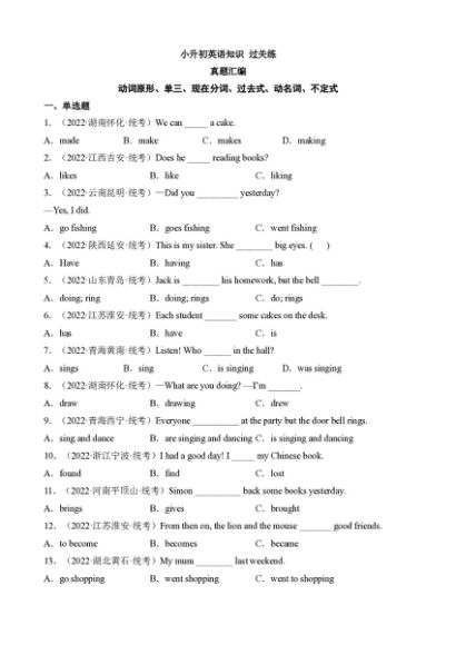 _专题06 动词原形、单三、现在分词、过去式、动名词、不定式(真题分类汇编)